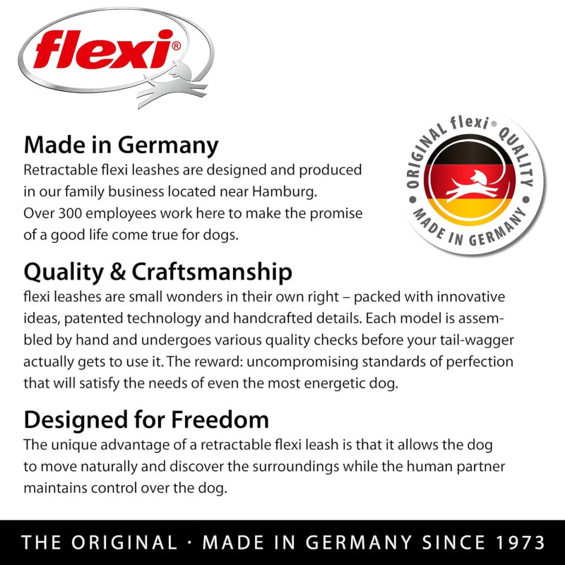 As trelas alemãs Flexi dão mais liberdade e segurança ao seu cão. Precisa, confortável e robusta, esta trela extensível da Flexi controla os movimentos do seu cão com um dedo.