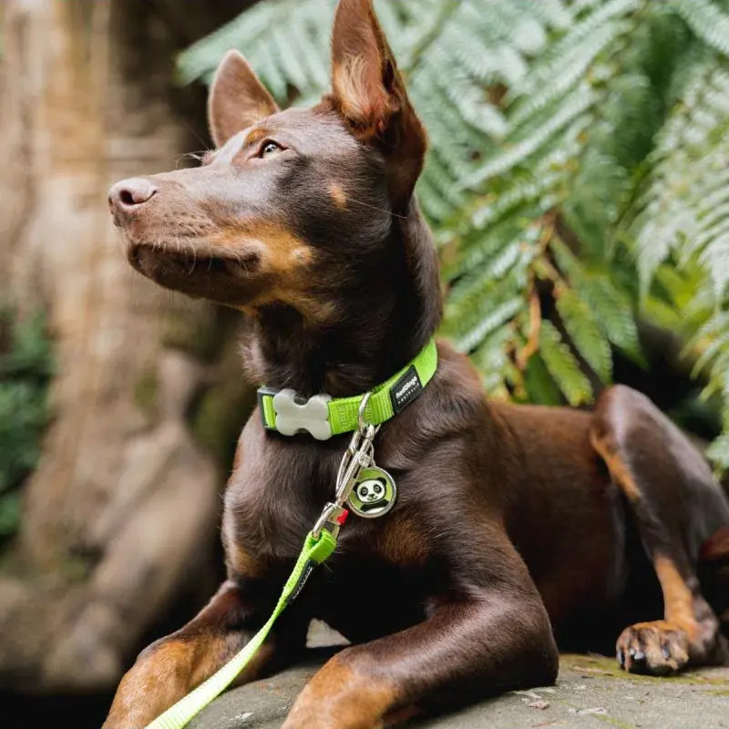 A coleira é ajustável e inclui um fecho de segurança que se abre rapidamente no caso de se prender.