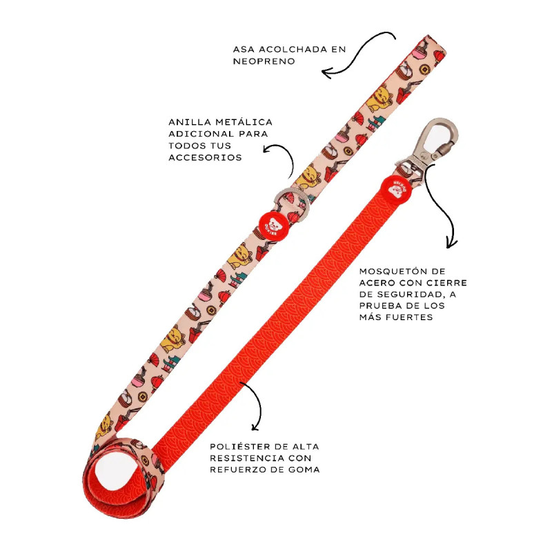 As trelas da Dukier são fabricadas com materiais resistente de nylon suave com uma pega forrada com neopreno acolchoado para que seja mais fácil de segurar. Tem ainda um mosquetão forte de metal para prender a trela à coleira ou ao peitoral.