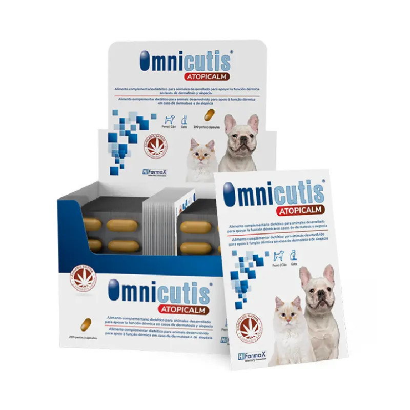 Omnicutis ATOPICALM contém a mais elevada quantidade por cápsula de ingredientes naturais. Os ácidos gordos Ómega-3 EPA e DHA são os únicos com um efeito anti-inflamatório puro. Contribuem assim para a manutenção da estrutura e funcionalidade da pele. O zinco é um elemento fundamental em diversos processos fisiológicos da pele e na regulação do sistema imunitário, atuando sinergicamente com os Ómega-3 na manutenção de uma pele e pelo saudáveis. As vitaminas A, C ,E e a biotina funcionam como antioxidantes e são fundamentais para o correto funcionamento dos processos fisiológicos da pele.