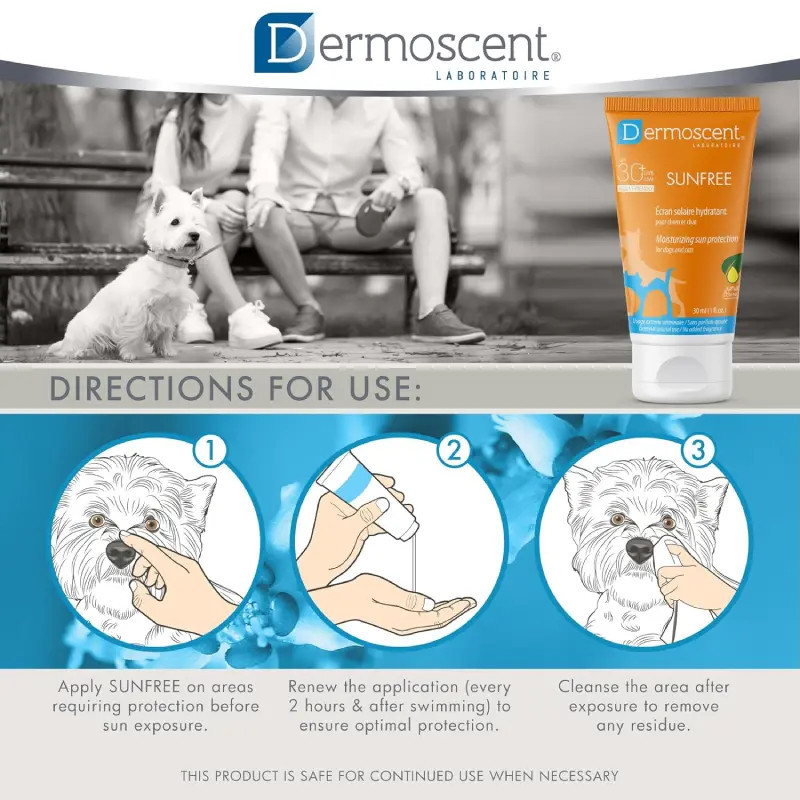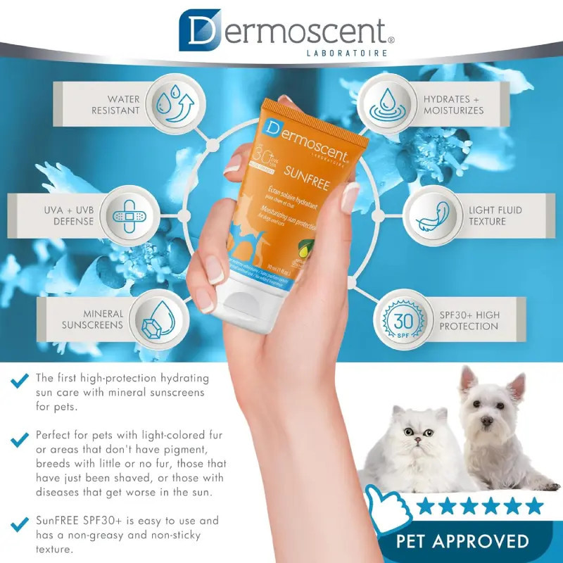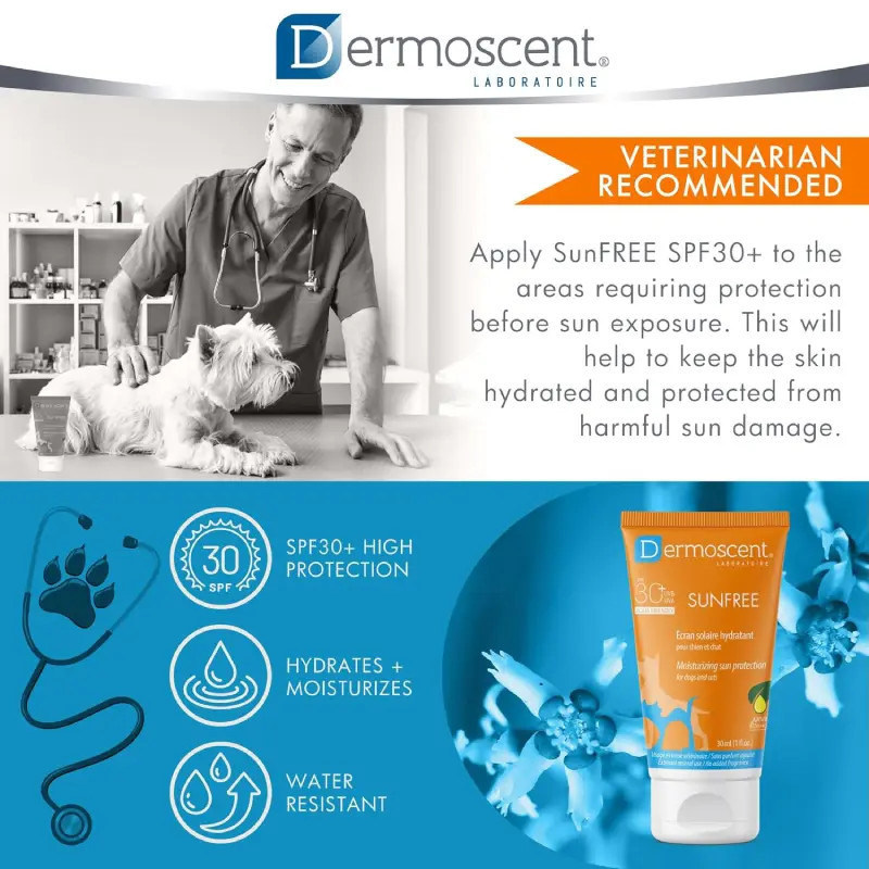 Dermoscent SUNFREE é um protector solar hidratante para cães e gatos, para áreas localizadas, com ação contra UVA e UVB (SPF30+).