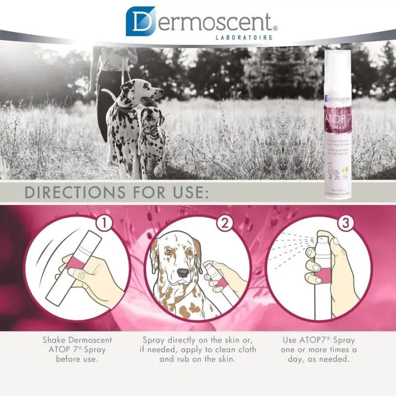 Dermoscent ATOP 7 Spray é um produto coadjuvante no tratamento de pele irritada e/ou propensa a alergias, para cães e gatos, para alívio imediato do prurido localizado sem cortico esteróides.