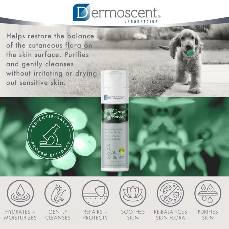 Ao contrário dos champôs antissépticos tradicionais, que podem ressequir a pele, o PyoClean limpa e purifica sem agredir, mantendo a hidratação natural da pele graças à sua fórmula rica em ácidos gordos essenciais (ómega 3 e 6) e ao complexo antimicrobiano natural PhytoC-2.