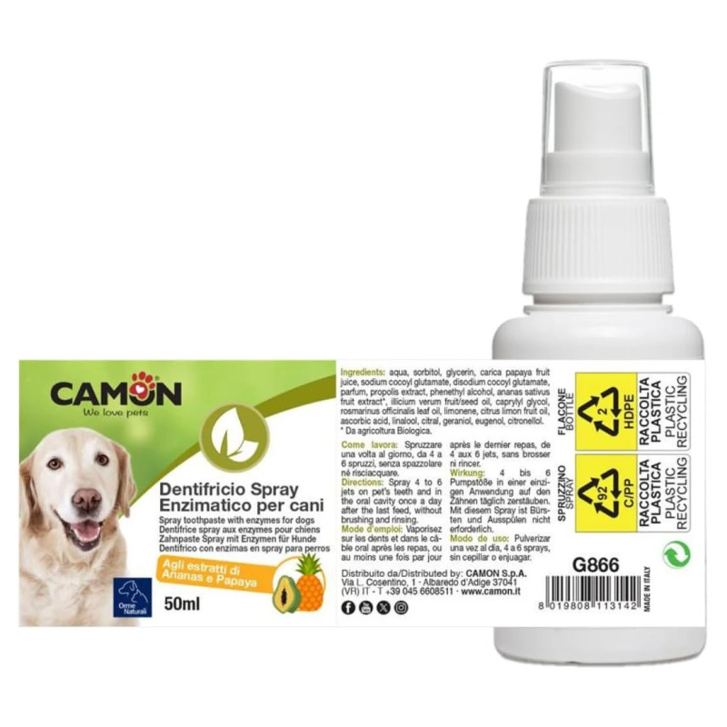 O Camon Spray Enzimático é um produto de higiene oral desenvolvido especialmente para animais de estimação, como cães e gatos. Trata-se de uma “pasta de dentes em spray”, prática e fácil de aplicar, ideal para tutores que têm dificuldade em escovar os dentes dos seus pets.
