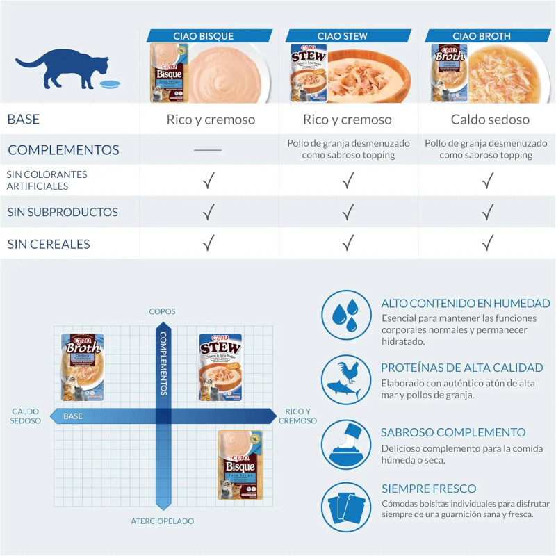 Adequado para gatos de todas as idades, desde gatinhos a séniores, o Churu Bisque pode ser servido de várias formas — diretamente da saqueta, como cobertura para ração seca ou húmida, ou simplesmente como um miminho irresistível.